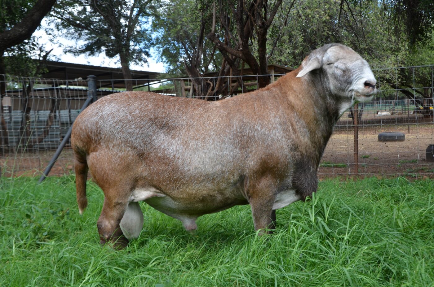 Meatmasters have short coats that shed naturally, requiring no shearing. Coat colors vary widely and include white, brown, red, black, and spotted combinations.