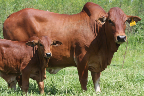 The cow has a well-carried udder and neat, small teats, in contrast to some Asian Zebu breeds. Boran heifers reach puberty at an average age of 385 days. She is an excellent mother, not only will she feed her calf well, but she guards against predators, and will never allow her calf to get lost in the bush. Calving problems hardly exist. Calves at birth weigh an average of 28 kg for males and females, 25 kg.